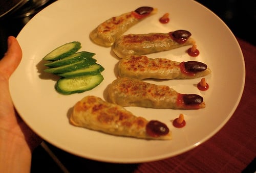 A finger anyone? Cut a cheese-covered pizza in thin triangles and add olive halves as fingernails. Any extra touch of ketchup is welcome.