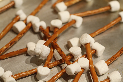 Craft bones from pretzel sticks and small marshmallows and arrange them on a plate in a shape of a human skeleton. If you’re really crafty sculpt a marshmallow to make a skull as well.
