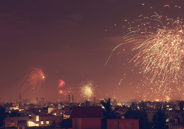 Worship happens during the evening before the highlight of the festival: fireworks. All over India the noise of these fireworks interrupts the peace of the night in a most spectacular way that’s definitely worth a photograph…