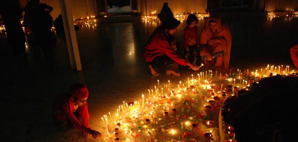 Over the five days of the festival, people clean their houses from top to toe and open up their windows to welcome Laksmi, the Hindu goddess of fortune. Masses and masses of candles and lamps are lit to greet her.