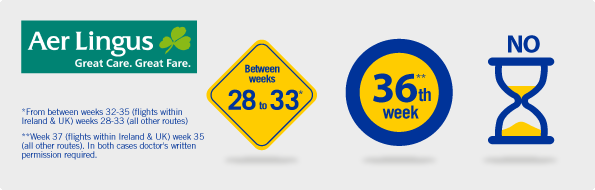 For all other Aer Lingus routes, it is allowed to travel up to week 27 of the pregnancy without written permission from a doctor/midwife. Between weeks 28-33, the woman must bring a Expectant Mother Travel Advice form completed by their medical professional. After week 34, pregnant women are not allowed to fly with Aer Lingus.