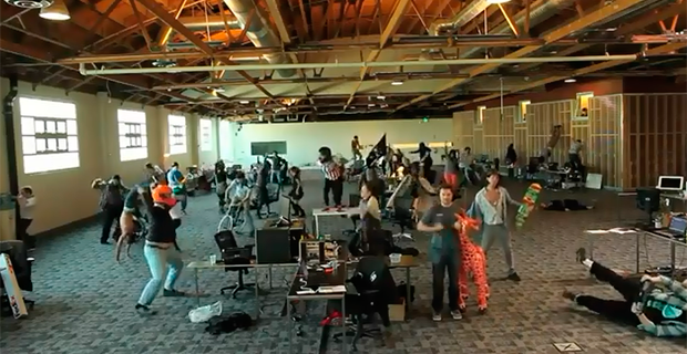 Here are the rules: the first part starts off with one person dancing (usually with a helmet on), while everyone else is non-chalantly doing something else. Then, the dancer’s lower extremities are taken over as if from a fit of madness, and all the others join in as well. How? In the most absurd, uncoordinated, craziest dance moves that come to mind.